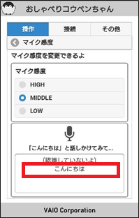 コウペンちゃんアプリを起動し、[操作]タブ → [マイク感度]をタップしていただき、コウペンちゃんに話しかけてください。